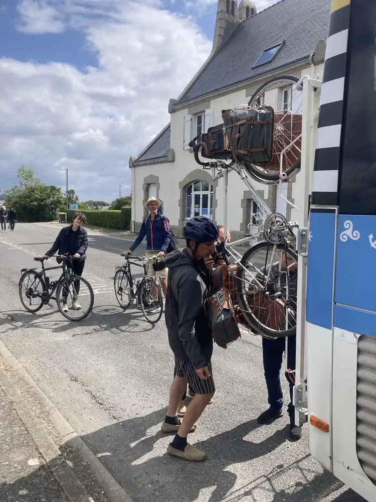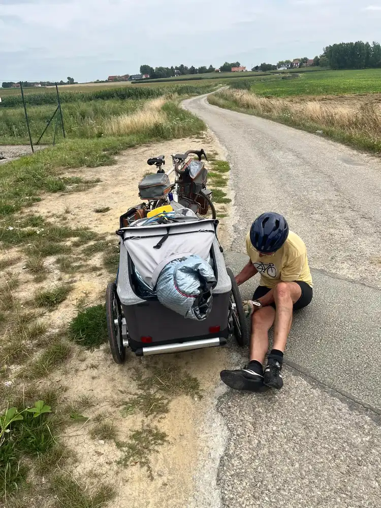 Notre expédition en Flandres a démarré avec peine. Les réservations dans un train pour voyageurs plus vélos ont été impossible pour les quatre musiciens. Pour la première fois depuis la création de Concerts en Roues Libres, nous avons rejoint notre point de départ avec une voiture équipée d’un porte-vélos. Gageons que ce ne sera pas la dernière fois. La SNCF a des progrès à faire… Notre carriole a aussi eu un problème mécanique au cours de la semaine. Les instruments ont fini le voyage dans des coffres de voiture.